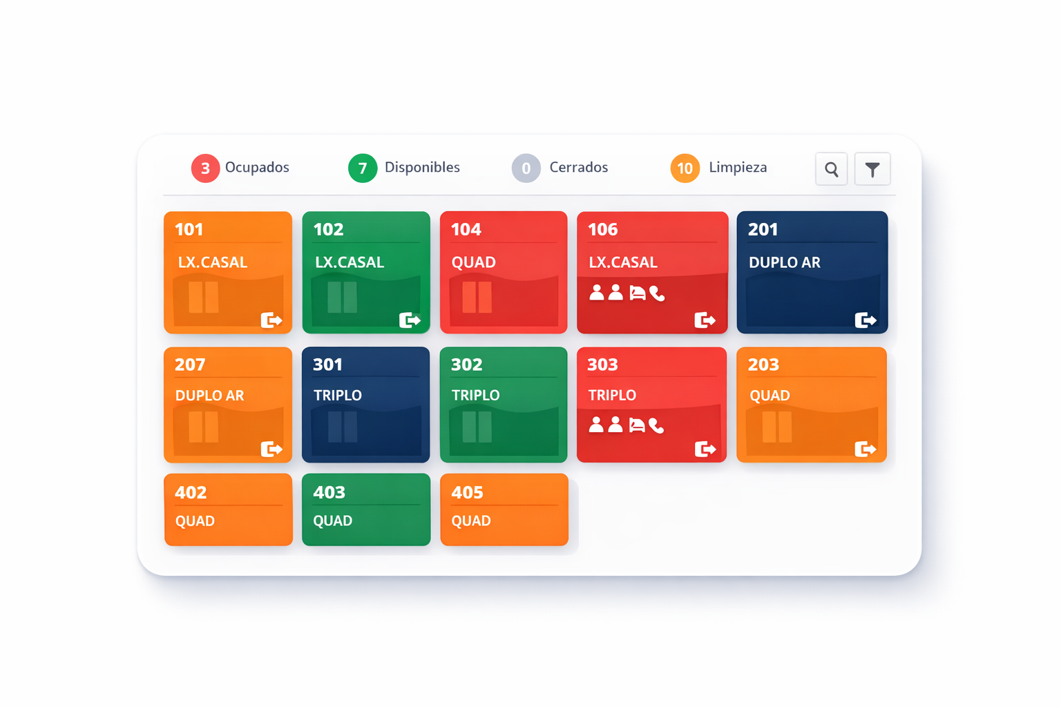 Mapa visual de habitaciones con estados en tiempo real: ocupadas, disponibles, limpieza y check-in/check-out